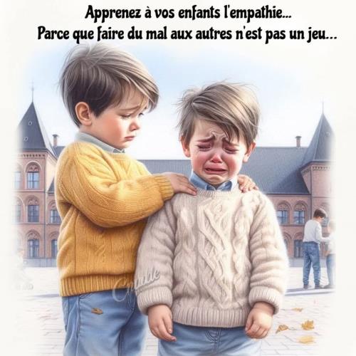 Coucou ;) Bonjours les copinettes :x Comment allez-vous ? Il fait du soleil pour le moment sinon c'est pluie et feuilles qui tombent Je cherche à prendre Rv pour 1 eccographie abdominable voir où en est la rate ,si elle rétrécit ou pas . :P Bref aujourd'hui suis dans les papiers. Va falloir faire du tri *-:) O:-) Mon frangin est en vacances 1 semaine il râle cause météo. Il est crevé. Qui regarde "un dimanche à la campagne ? Par contre je n'apprécie pas qu'il est virée Laurence Bucolini donc je zappe Non lundi à vous toutes :x :x :x :x :x bises we moua Dans les yeux d’un enfant, le monde est encore malléable, fragile, plein de promesses. C’est là, dans cette terre fertile, que l’on plante les graines de l’humanité. L’empathie n’est pas une option, c’est une nécessité. Elle est ce fil invisible qui relie les cœurs, qui transforme les gestes en tendresse et les mots en réconfort. Quand un enfant rit du chagrin d’un autre, ce n’est pas une farce. C’est un signal. Un appel à l’éducation, à la transmission des valeurs qui font de nous des êtres humains. Car derrière chaque moquerie, chaque exclusion, chaque blessure infligée, il y a une âme qui vacille, un cœur qui se referme un peu plus. Enseignons-leur à se mettre à la place de l’autre. À écouter sans juger. À tendre la main plutôt que de pointer du doigt. Le respect, l'empathie, la bienveillance, la douceur… Ce sont les plus beaux cadeaux que vous puissions leur offrir. Car un enfant qui comprend la douleur de l’autre ne la provoquera pas. Il deviendra un adulte qui soigne, qui unit, qui construit. Et dans ce monde parfois trop dur, ce sont ces enfants-là qui feront la différence. |
