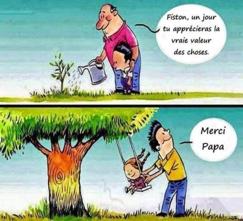 Coucou ;) Bonjour les :x Merci Poffe de ton passage :x Je crois que vous hiberner toutes ? Suivants les résultats de la prise de sang lundi ce qu'elle dit ,si pas de transfusion ( 4 mois 1/2 que j'en ai pas eu c'est bien ) j'arrête tout .car c'est pas une vie :-S Bon samedi à toutes :x :x :x :x :x bises de moua Tous les ans, les parents de Martin l'emmenaient chez sa grand-mère pour les vacances d’été, et ils rentraient chez eux par le même train le lendemain. Un jour Martin dit à ses parents: «Je suis assez grand maintenant. Si j’allais chez grand-mère tout seul cette année ?» Après une brève discussion les parents sont d’accord. Les voici debout sur le quai de la gare, le saluant, lui donnant un dernier conseil par la fenêtre, tandis que Martin continue à répéter: «Je sais, vous me l’avez déjà dit cent fois.!» Le train est sur le point de partir et le père chuchote: «Mon fils, si tu te sens soudainement mal ou effrayé, c’est pour toi ! » Et il lui glisse quelque chose dans sa poche. Maintenant, le garçon est seul, assis dans le train, sans ses parents, pour la première fois. Il regarde le paysage par la fenêtre qui défile.. Autour de lui des inconnus se bousculent, font du bruit, entrent et sortent du compartiment, le contrôleur lui fait des commentaires sur le fait qu'il soit seul. Une personne lui jette même un regard triste. Du coup, le garçon se sent de plus en plus mal à l'aise..Et maintenant il a peur. Il baisse la tête, il se blottit dans un coin du siège, les larmes lui montent aux yeux. À ce moment-là, il se souvient que son père lui a mis quelque chose dans la poche. D'une main tremblante il cherche à tâtons ce morceau de papier, il l’ouvre: «Mon fils, je suis dans le dernier wagon. » C’est ainsi dans la vie. Nous devons laisser partir nos enfants,en leur faisant confiance.. Mais nous devons toujours être dans le dernier wagon afin qu’ils n’aient pas peur.. |